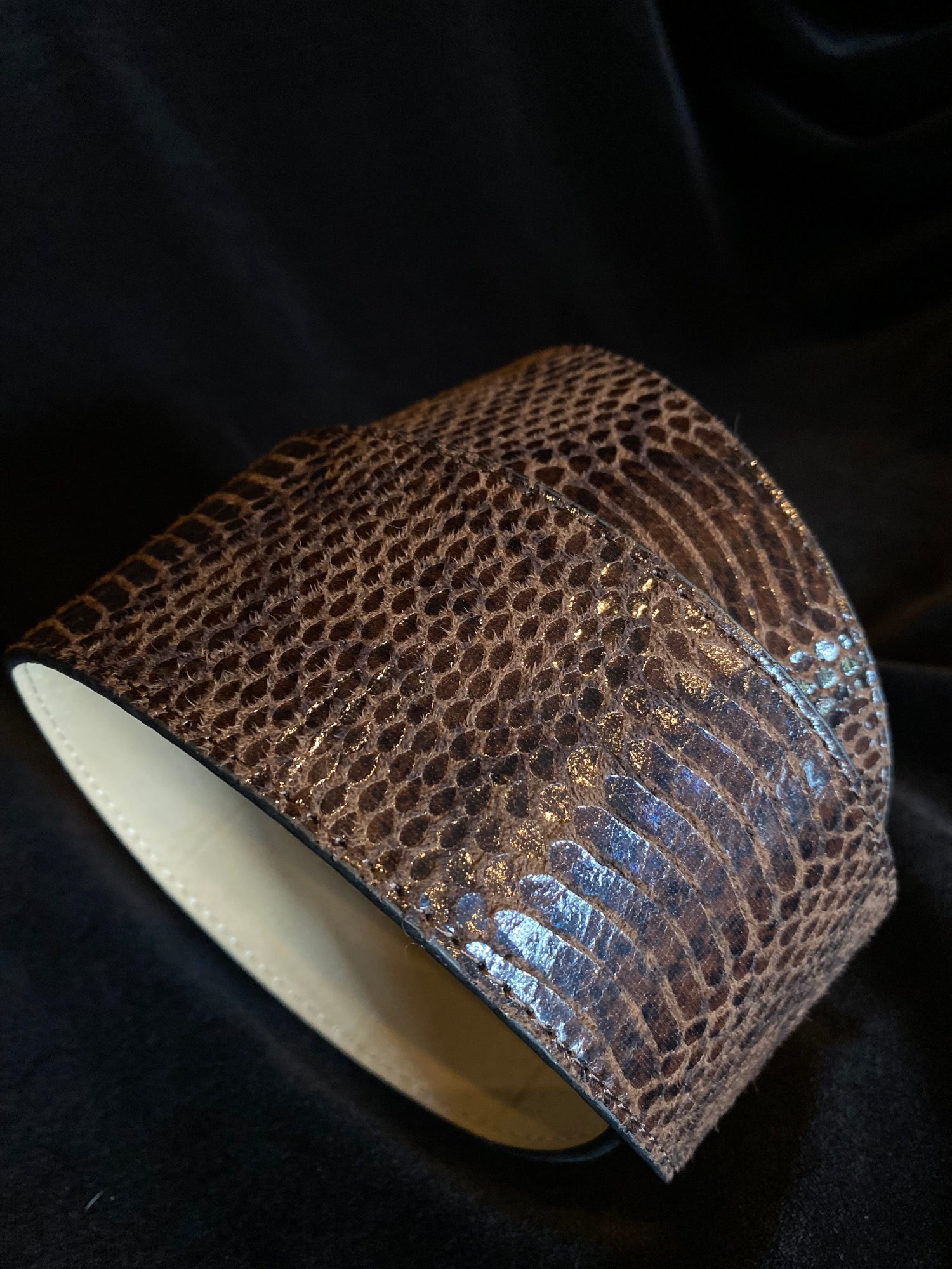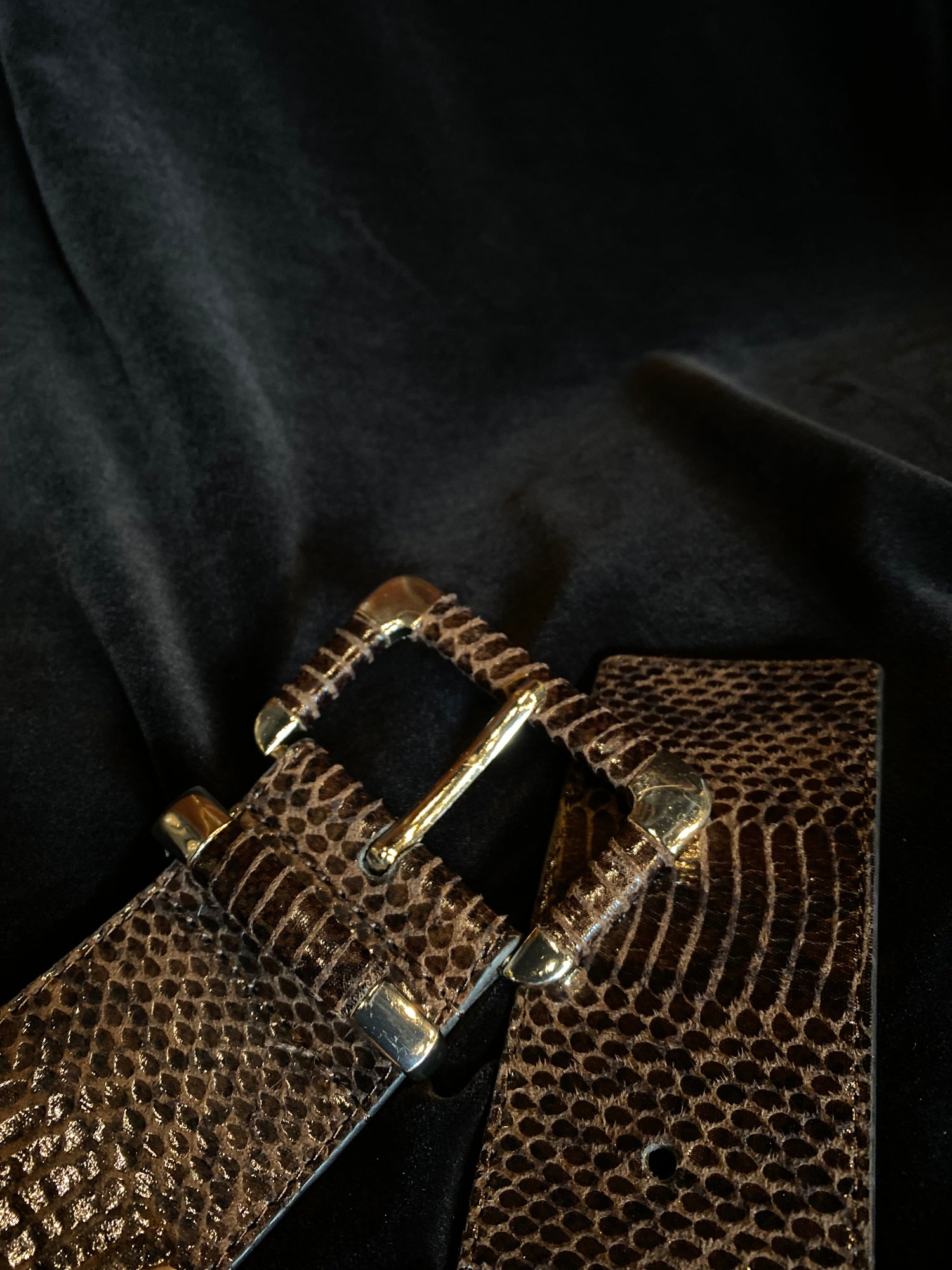 This wide and gorg waist belt is made of shiny and wild textured faux snake skin for an exotic touch and makes a statement in any fit!