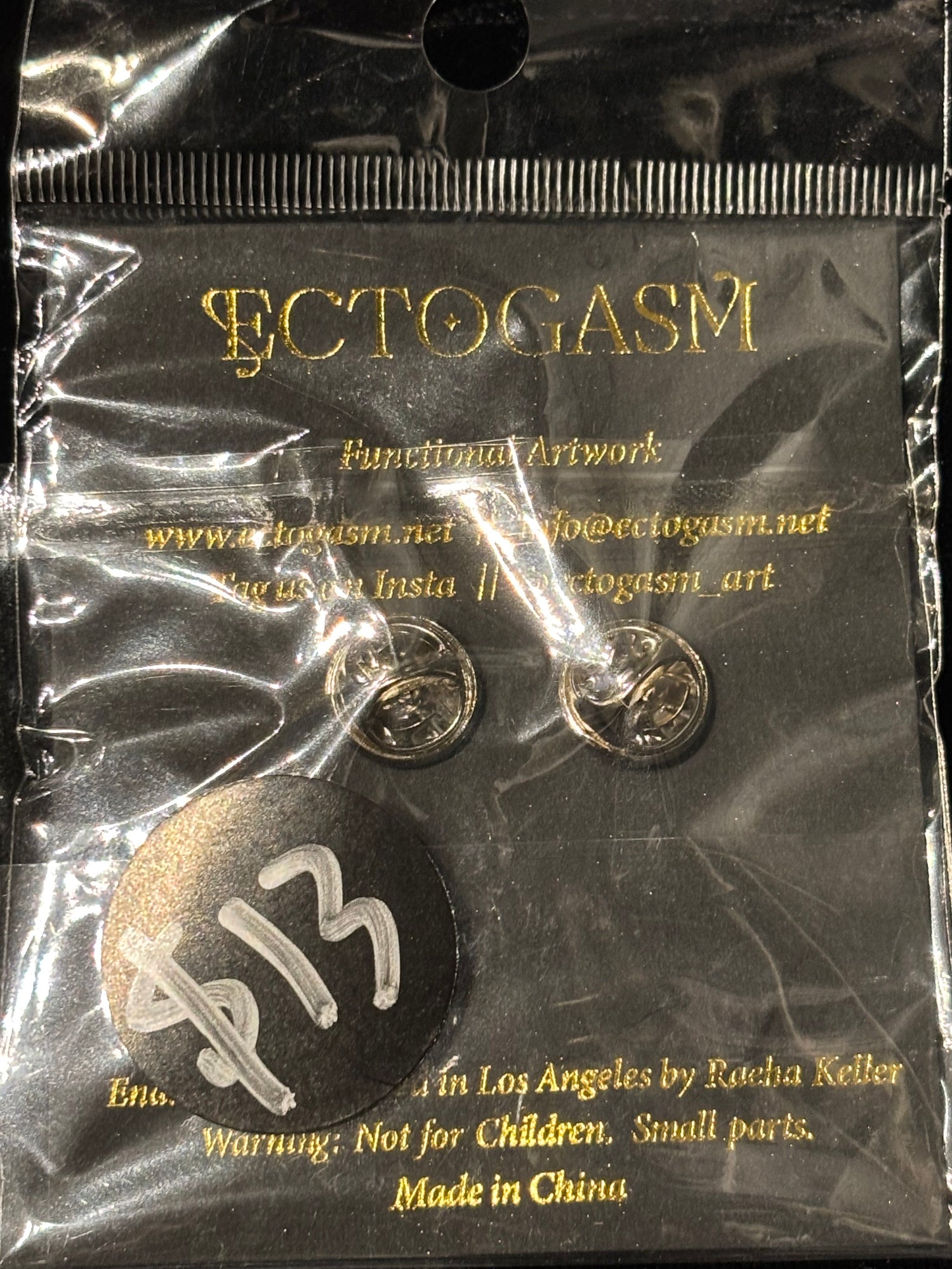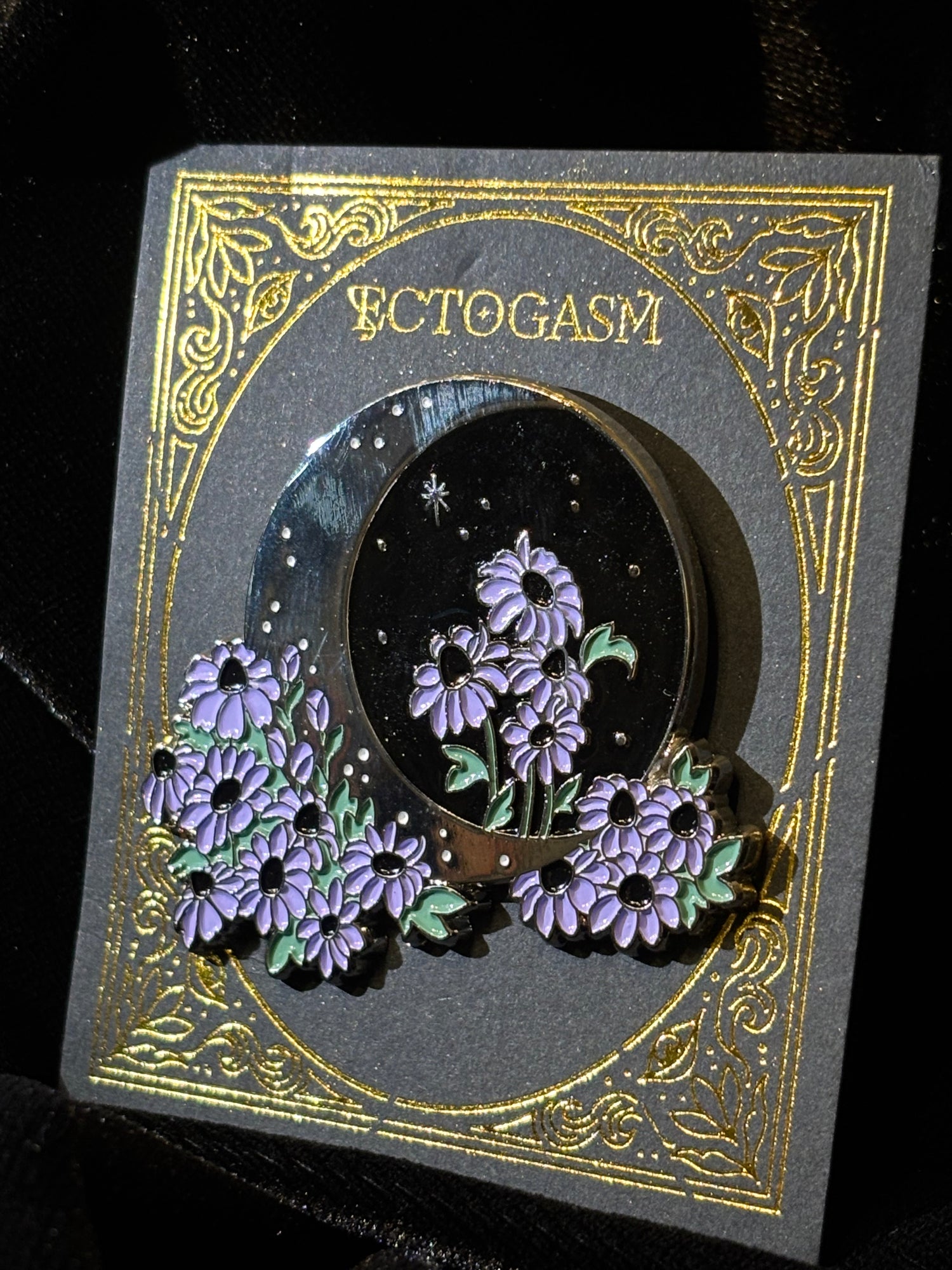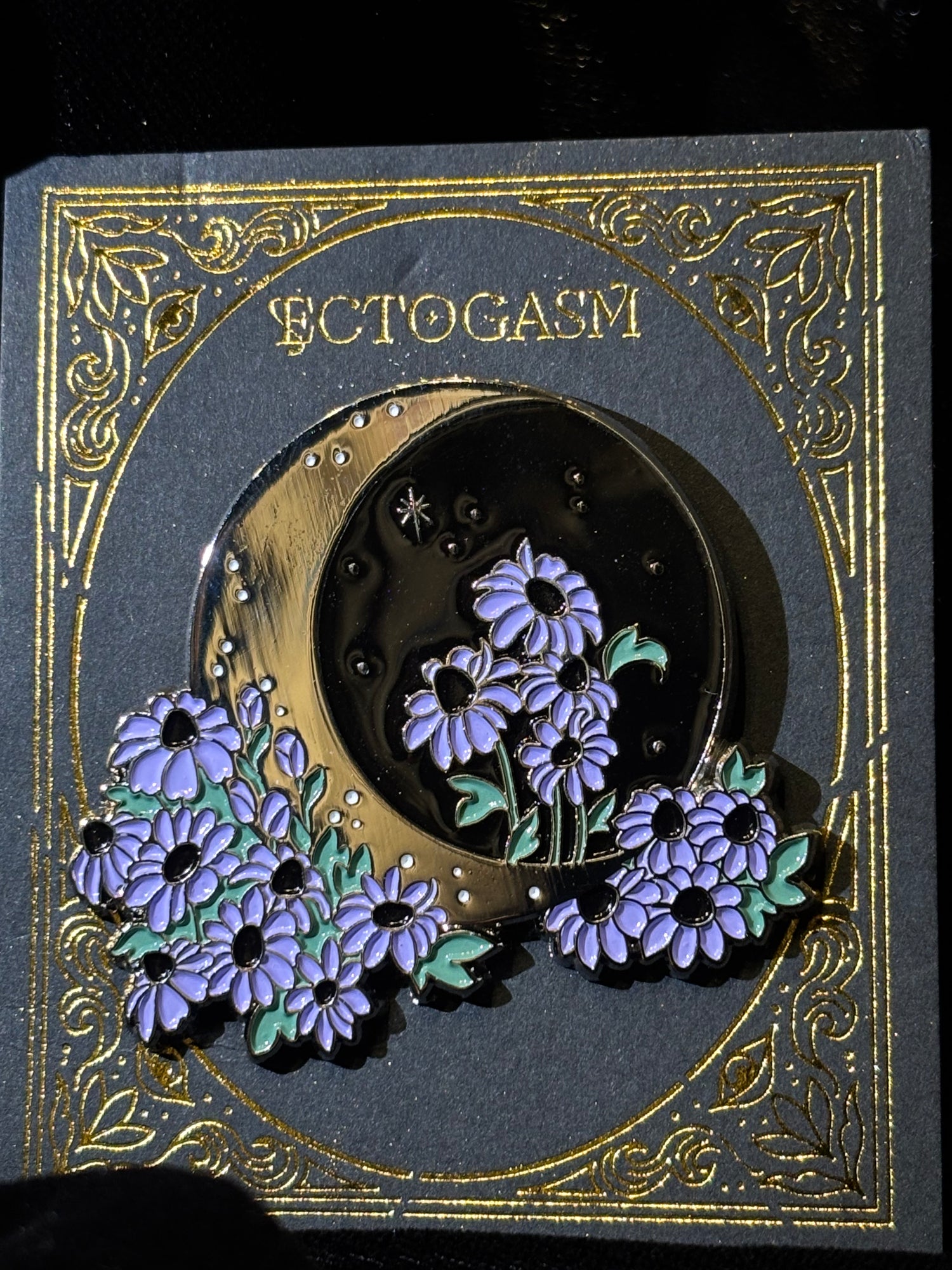 “This beautiful, witchy pin features a silver crescent moon with a starry night sky and purple flowers. It looks lovely adorning the lapel of a jacket or embellishing a purse.”-Ectogasm website