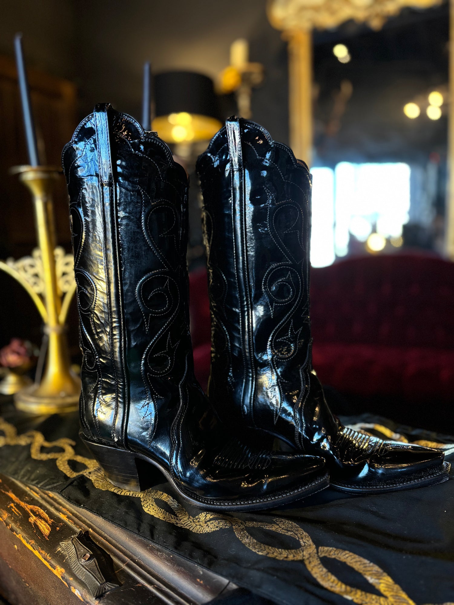 Absolutely one of THE most luxe pair of cowboy boots we’ve had in the shop! If you know cowboy boots then you know how high quality these boots are. Lucchese doesn’t mess around when it comes to detail and design and these are no exception. Very soft genuine patent leather just waiting to go home with you!