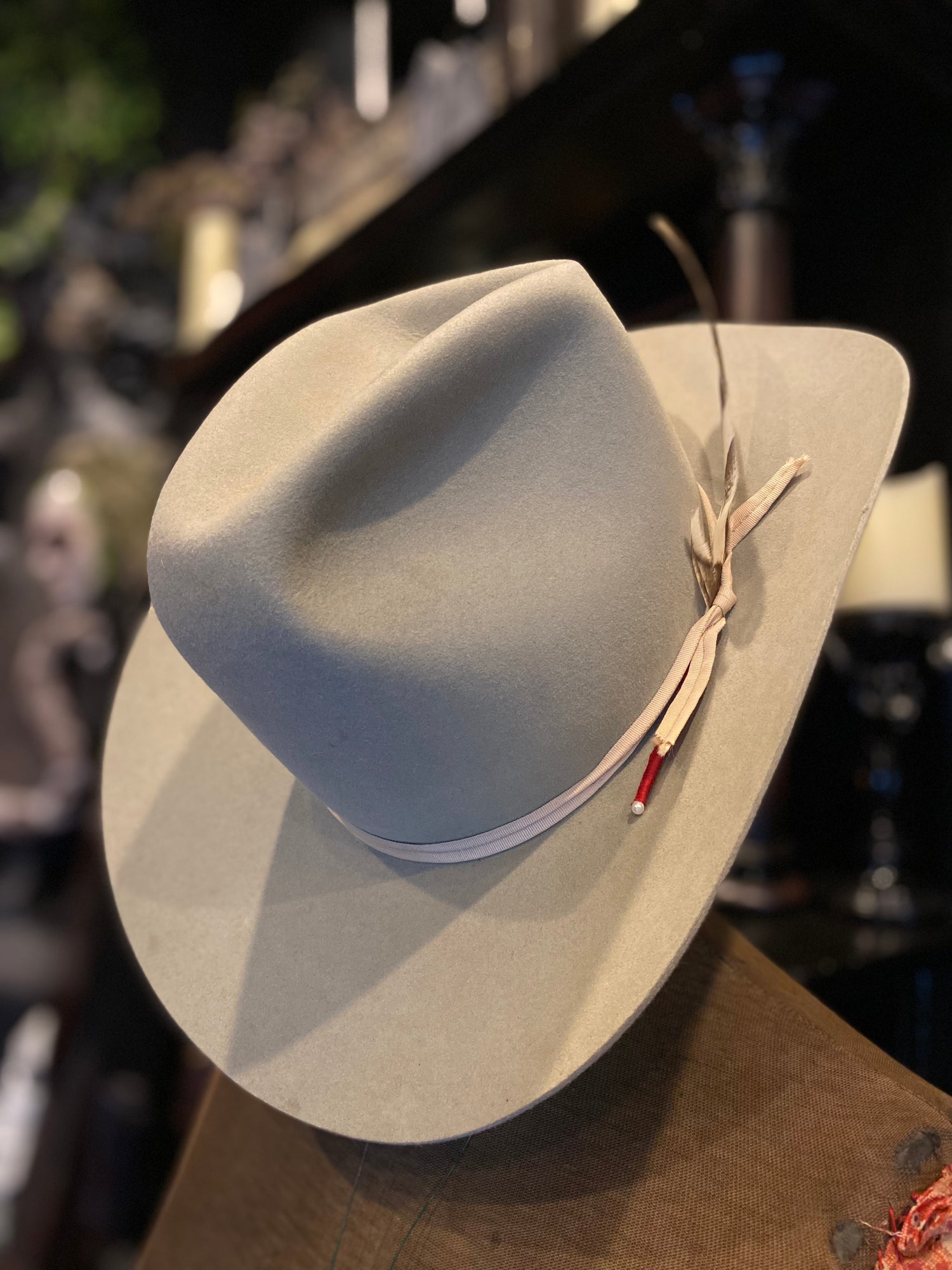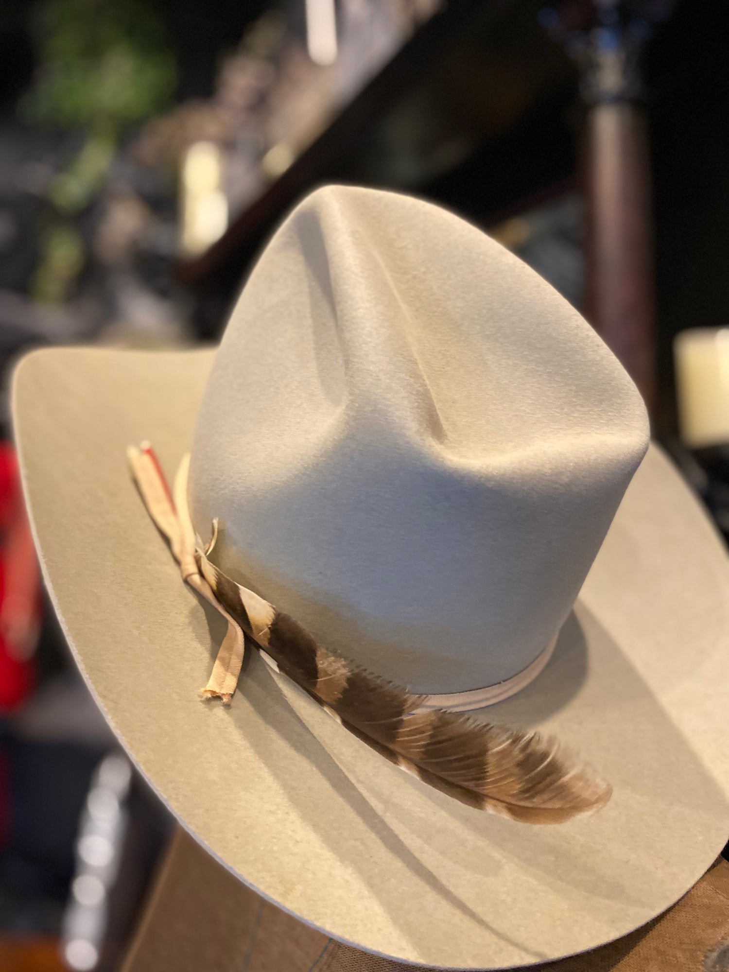 A classic and quality cowboy hat, in a beautiful taupe felt with a gorgeous feather in the band for a bit of flair!